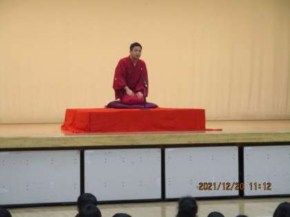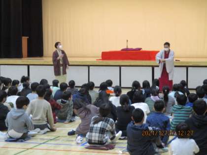 今日は、文化庁主催「文化芸術による子供の育成事業(芸術家派遣事業)」を行いました。新進気鋭の落語家である柳亭市弥さん、入船亭遊京さんのお二人をお招きして落語を披露していただきました。また、質問タイムや所作の説明、扇や手ぬぐいの使い方などワークショップも行っていただくなど落語の世界に浸る時間となりました。落語には、映像や音響はありません。語り方、声、表情、間、しぐさがとても大切であることを学びました。柳亭市弥さん、入船亭遊京さんご指導ありがとうございました。