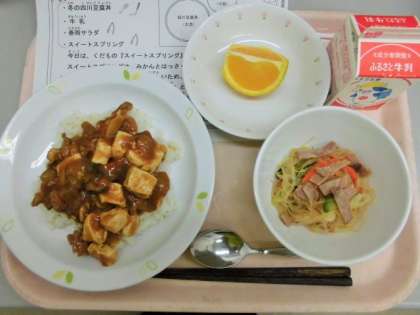 今日は、四川豆腐丼、牛乳、春雨サラダ、スイートスプリング(※かんきつ類の一種)です。