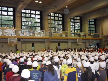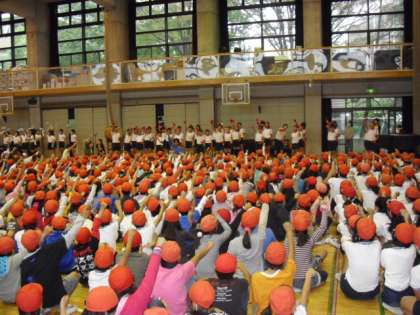 昨日に続き今日も運動会に向けた全校練習が行われました。あいにくの雨の中、体育館で開閉会式や応援の練習を行いました。元気な応援の声は雨を吹き飛ばしそうなほどでした。