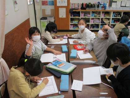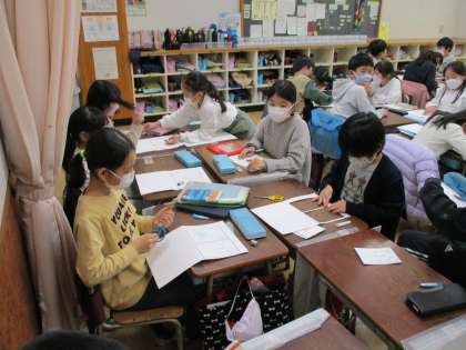 3年生の国語で、「カンジ—博士の音訓かるた」に挑戦しました。音読みと訓読みを学びながら、5,7,5の歌を詠みました。友達と話合いながら、楽しく学習を進めることができました。