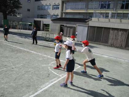 2年生の体育でキックベースボールに挑戦しました。守備と攻撃に分かれてチームごと競い合いました。攻めも守りも互いに声を掛け合って楽しむことができました。