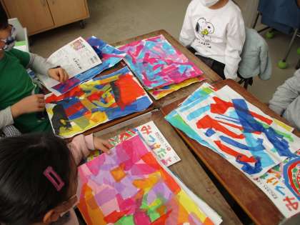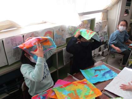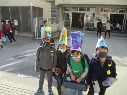 2年生の図工「かぶってへんしん」では、紙で帽子をつくりました。思い思いの色を塗って紙を貼り合わせて完成しました。一人一人個性ある作品に仕上げました。