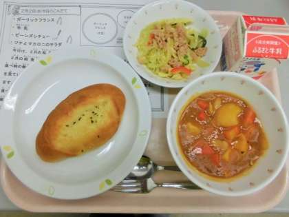 今日は、ガーリックフランス、牛乳、ビーンズシチュー、ツナとマカロニのサラダです。