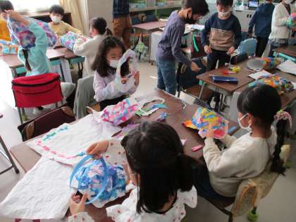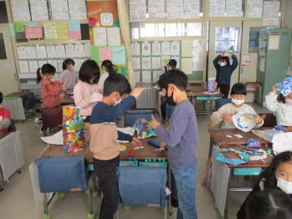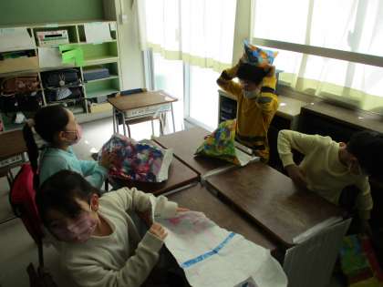 2年生の図工では「かぶってへんしん」というカラフルな帽子を作っています。