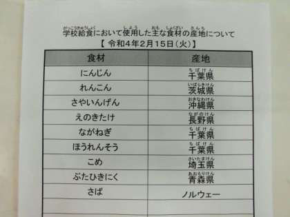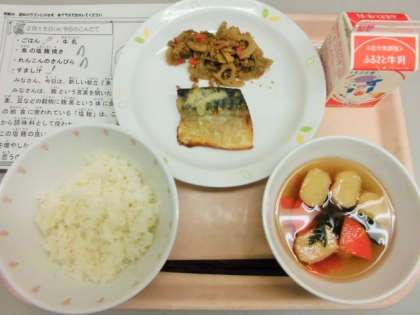 今日は、ごはん、牛乳、魚の塩麹焼き、れんこんのきんぴら、すまし汁です。