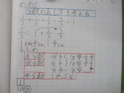 4年生の算数では「分数」に取り組んでいます。真分数、仮分数、帯分数といった分数を理解することができました。ノートのまとめ方も丁寧です!素晴らしい!