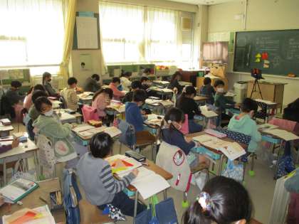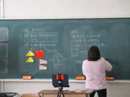2年生の算数では「1を分けて」の学習をしました。分数の入口です。1を2つ分けることを1/2といいます。大人だと「当たり前」で終わってしまいます。2年生の子どもたちは時間をかけて、実際に具体物を使って学習しました。分数の学習は3年、4年、5年、6年と続きます。