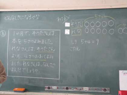 文章を読んで意味を把握し、式に表すことが学習のめあてです。式は5+4になりますが、5+4=9という計算問題とは学習の目的が違います。子どもたちは、文章を読んで式に合わらすことができました。