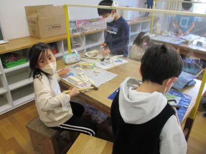 3年生の図工では「釘打ちトントン」に取り組んでいます。トンカチを使って釘を打ち、作りたいものを作ることができました。自動車、動物、植物、様々なものを作りました。