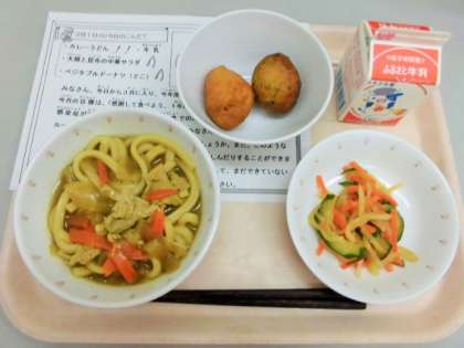 今日は、カレーうどん、牛乳、大根と昆布の中華サラダ、ベジタブルドーナツです。
