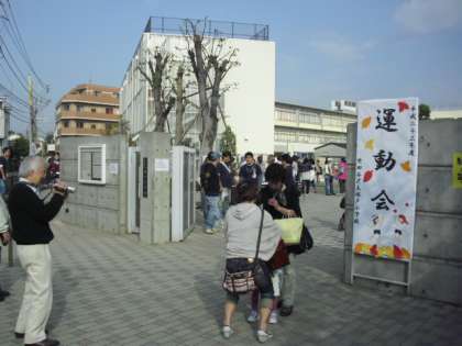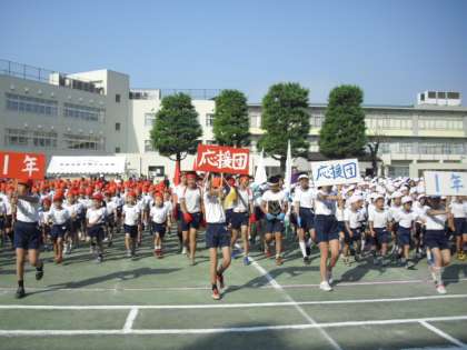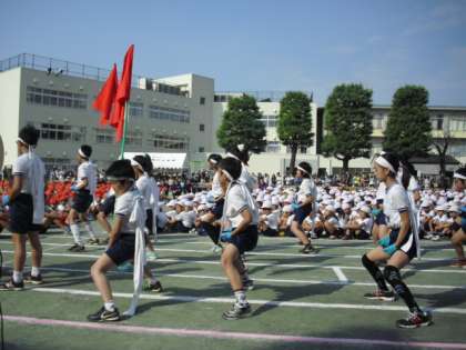 秋晴れの中、運動会が行われました。「協力・努力・全力 塚戸の力で最高の運動会にしよう」というスローガンで、子どもたちは頑張ってきました。全校児童987名の大規模な運動会の始まりです。開会式、応援合戦です。