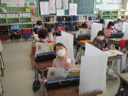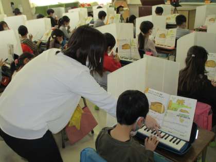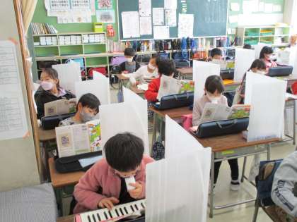 2年生の音楽では鍵盤ハーモニカに取り組んでいます。特性のアダプターを使って「飛沫」が飛ばない工夫をしています。