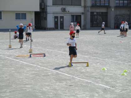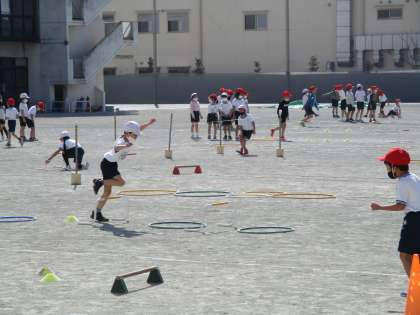 1年生の体育を参観しました。フラフープを置いた場所を走ったり、ゴム跳びをしたりと多くの「場」を作っていました。子どもたちは様々な場を選び、1時間の授業ですが様々な運動経験をしました。
