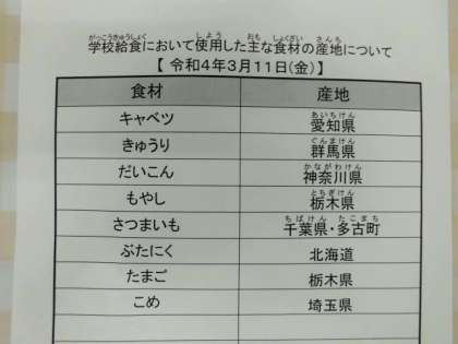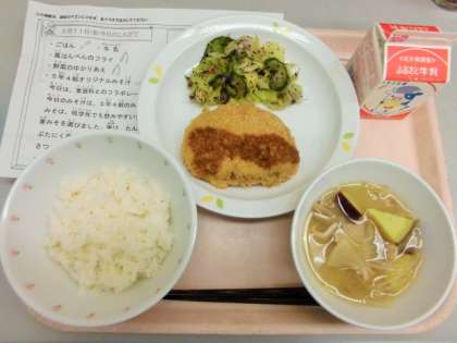 今日は、ごはん、牛乳、黒はんぺんのフライ、野菜のゆかりあえ、野菜のオリジナルみそ汁です。