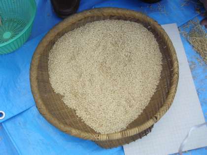 脱穀作業には、こんな道具を使いました。昔の道具です。お米は昨年と同じくらいとれました。約5kgです。