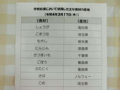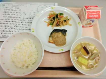 今日は、ごはん、牛乳、魚のごまだれかけ、野菜のからしじょうゆかけ、5年1組オリジナルみそ汁です。