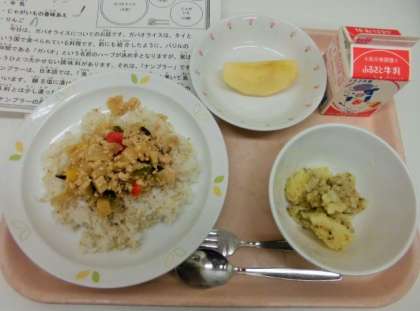 今日は、ガパオライス、牛乳、じゃがいもの香味和え、りんごです。