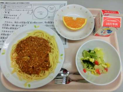 今日は、スパゲティーヘルシーミートソース、牛乳、カラフルサラダ、清見オレンジです。