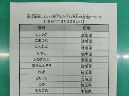 給食最終日の今日は、卒業・修了お祝いし、赤飯、牛乳、鶏肉のから揚げ、華風和え、お祝い汁です。