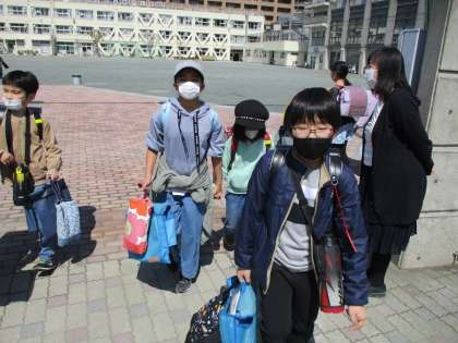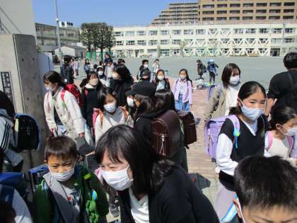 明日から春休み、正門で校長先生と挨拶を交わす子どもたちの様子です。一人一人笑顔いっぱい、いい表情です。6年生は明日、卒業式です!