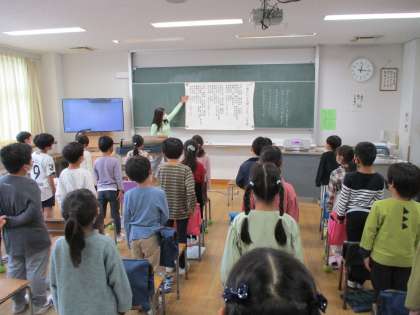 2年生の音楽を参観しました。「校歌」の練習をしており、講師の先生の指導をしっかり聞いていました。先生のわずかな指導で、子どもたちの歌声が変わりました。素晴らしいです!