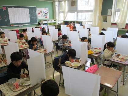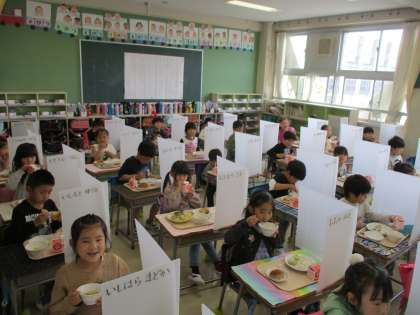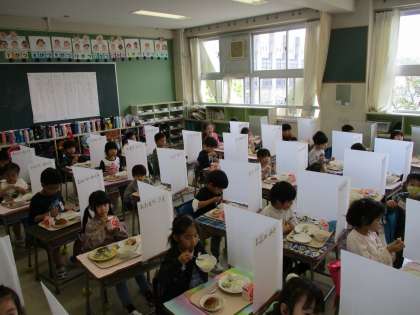 月曜日から始まった1年生の給食ですが、とても上手に準備ができています。おひさまボランティアさんのご協力をいただきながら安全に配膳ができています。学習も始まり、座り方や話の聞き方も立派です。