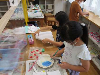 絵の具を使って自分色紙をつくりました。絵の具を「こすったり、押したり、垂らしたり」してできた独自の模様を楽しみました。