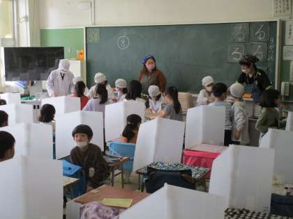 1年生の給食の風景です。おひさまボランティア(1年生の給食の手伝いボランティア)さんが大活躍。本当にありがたいです。おかげで、1年生もスムーズに配膳ができるようになってきています。