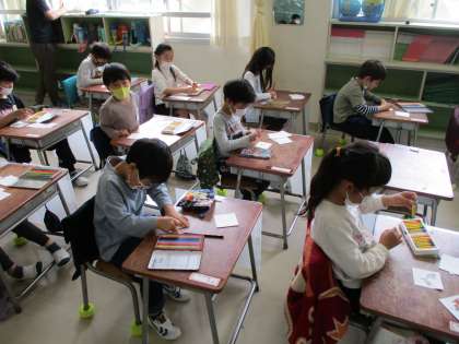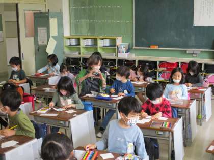 1年生の図工を参観しました。今日はすきなものをテーマに食べ物や動物など、自由に描いていました。自由と言っても勝手に取り組むこととは違います。自分の自由な発想という意味です。1年生の子どもたちも夢中になって取り組んでいました。