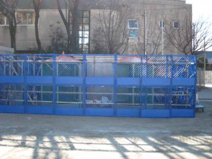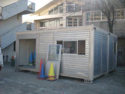校舎増築工事に伴い、新しい体育倉庫と飼育小屋ができました。1年間の仮の住まいです。ウサギとニワトリも、新しい家に引っ越しました。