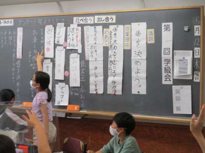 6年生の教室では活発な話し合いが行われていました。議題は「係を決めよう」です。さすが、6年生です。話し合いも、相手の意見を尊重しながらも、必要だと思う係を提案しました。しかし、一番大切なことは「決まった係で責任をもって取り組むこと」です。係活動の取組を期待します。