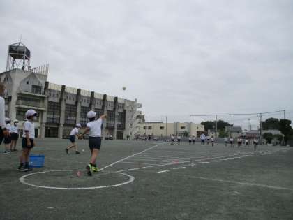 体力テストのソフトボール投げの様子です。体力テストのねらいは、児童一人一人が自分の運動能力を理解し、向上に努めようとする意識を育むことです。
