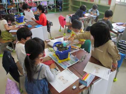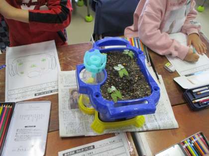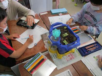 1年生が植えたあさがおの種が発芽しました。今日はふた葉の様子を観察しました。