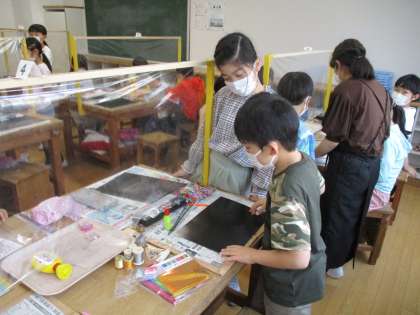 4年生の図工で「キラキラワールド」に取り組んでいます。キラキラ光る材料を切ったり、並べたり、重ねたりして、輝く世界を表しました。個性あふれる作品、楽しみにしています。