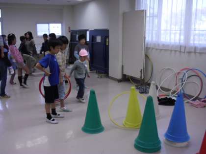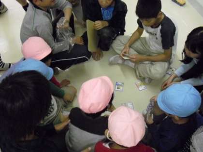 今日は5年生が塚戸幼稚園の園児たちを招いて交流会を行いました。