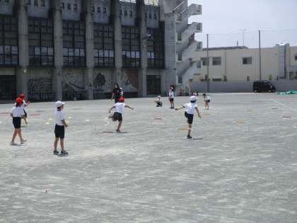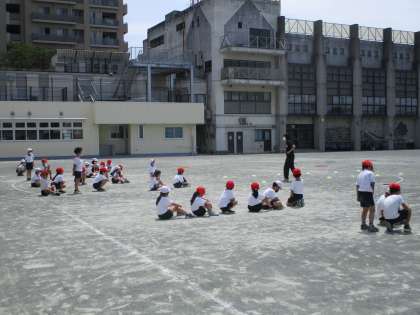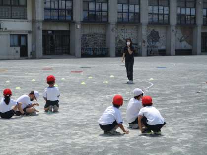 2年生の体育を参観しました。かけっこあそびをしました。フラフープコースやミニハードルなど、いろいろなコースを走りました。暑い中頑張りました。