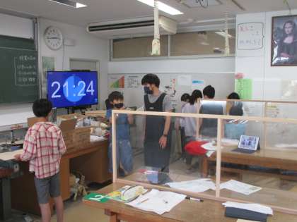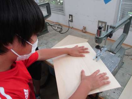 電動糸のこぎりを使って取り組んでいます。安全に気を付けてくださいね!