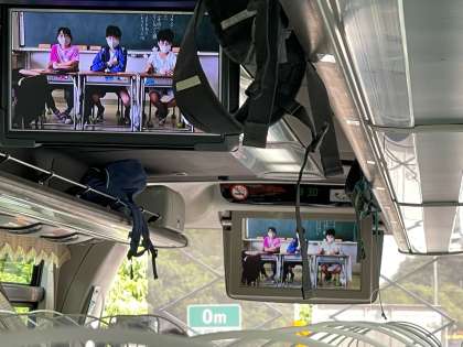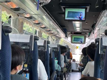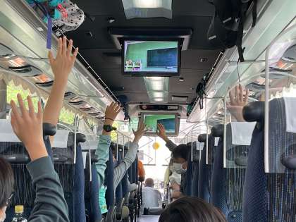 三芳パーキングを出ると事故渋滞でバスは速度を落として走っています。子どもたちはバスレクがはじまり、仲よく楽しんでいます。友達のがんばりに拍手をおくっています。移動エンジョイ係の子どもたちが作ったバスレクのため動画、1時間の大作です。