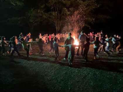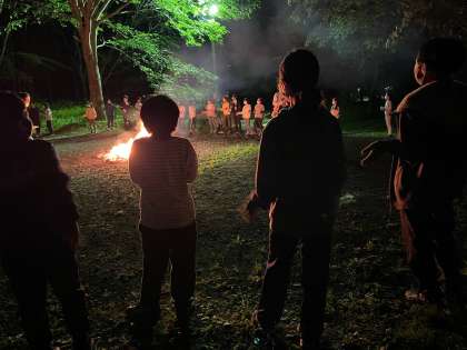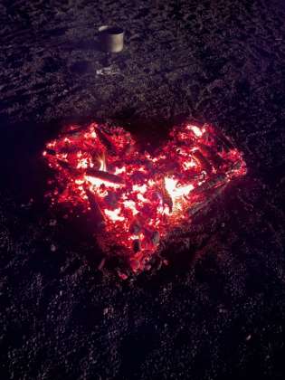 火が少しずつ消え始め、楽しかったキャンプファイヤーも終わりが近づいてきました。気がつくと、ハート型のやわらかな火が浮かび上がってきました。補助員さんのプレゼント、残り火アートです。