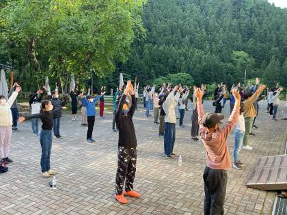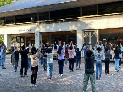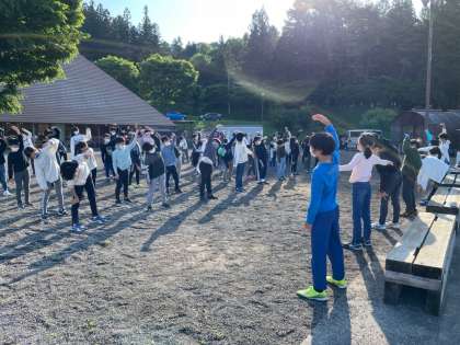 川場移動教室第2日目がスタートしました。とてもいいお天気です。朝の支度をして朝会を行いました。「朝の目覚めスイッチ係」が前に立ち、ラジオ体操で元気のスイッチを入れました。どちらのビレジもみんな元気です。