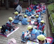 12時30分、お弁当の時間になりました。おうちの人が作った愛情たっぷりのお弁当。みんなで外で食べると、食が進みます。ごちそうさまでした。