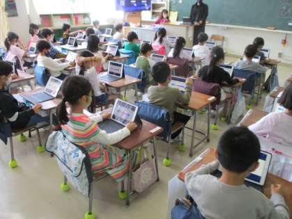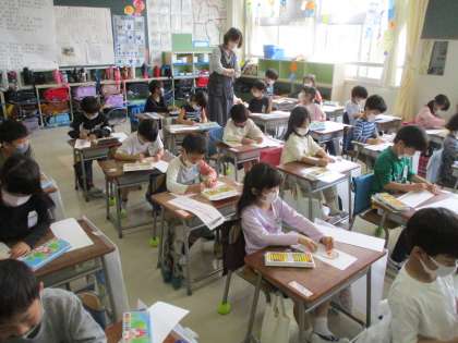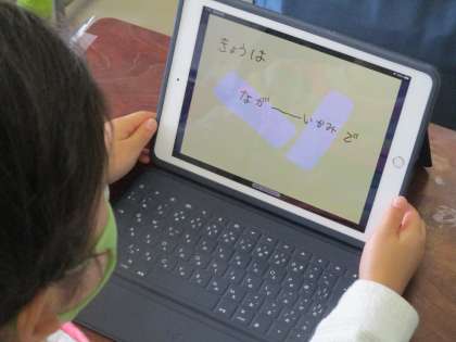 1年生の図工の学習の様子です。「ながーい紙から」という単元で、「長いもの」を想像して描きました。子どもたちに学習のイメージを持たせるために学習のはじめに、タブレット端末を使って「紙芝居風」に説明をしました。子どもたちは、真剣に画面を見つめ、今日の学習の見通しをもつことができました。図工という学習ですが、タブレット端末を効果的に活用して授業を進めています。