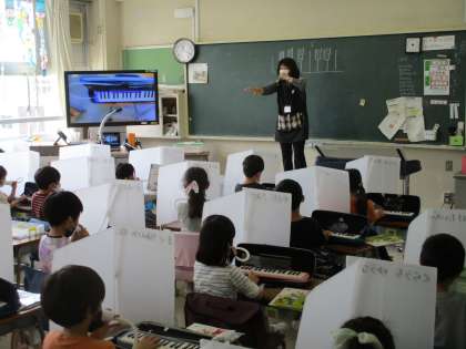 担任の先生が台に乗って1年生全体を見渡しています。今日は音楽で「鍵盤ハーモニカ」を学習し、ド、レ、ミの練習をしました。先生の合図が大切で、自由勝手に吹いては授業が成り立ちません。一人一人が先生をよく見て練習ができました。