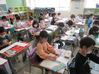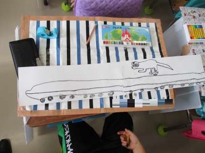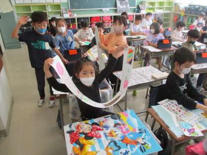 1年生の図工「ながーい紙から」に取り組んでいます。ながーい動物、ながーい食べ物、ながーい乗り物、ながーい花 1年生の子どもたちの自由な発想に驚かされます。子どもたちも楽しく取り組む姿が見られました。