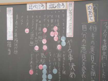 なかよしフェスタの内容を決める話し合いをしました。このクラスは「なかよしフェスタを通して、クラスの団結を図ること」を目指しています。当日だけでなく、話合いや準備、片付けなどすべてが「なかよしフェスタ」です。クラスの団結を目指して取り組んでください。