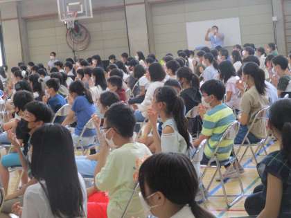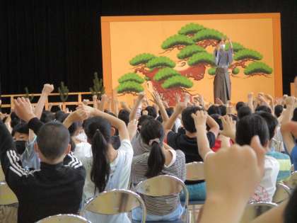 今日は、6年生の「古典芸能教室」がありました。千歳小学校の児童も来校され、一緒に鑑賞しました。狂言「附子」を鑑賞し、講師の先生から解説を聞き、ワークショップを行いました。きっと、子どもたちは日本古来の狂言を実際に鑑賞し、日本の伝統文化に触れることで日本の素晴らしさを改めて認識することができました。