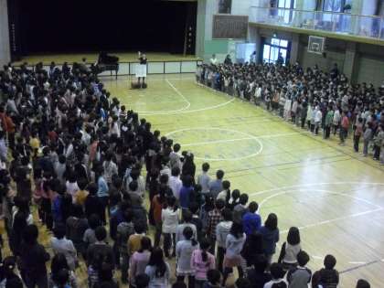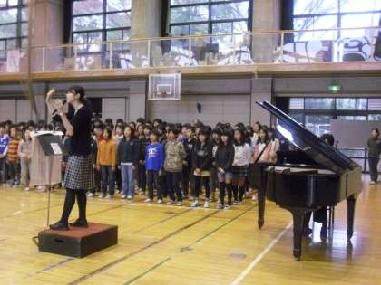 今日の朝は、音楽朝会でした。「もみじ」の全員合唱です。2分合唱で歌いました。素晴らしい歌声を聴かせてくれました。