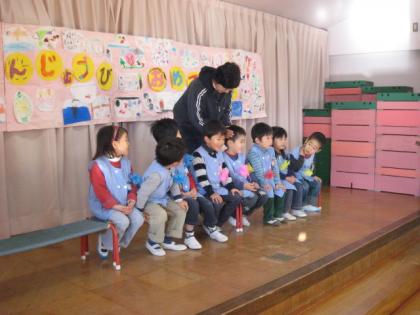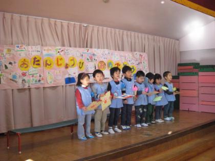 1月の誕生会がありました。1月生まれは8人です。おめでとう。今日のお楽しみはビデオを見ました。何を見たかはお子様から聞いてください。楽しかったそうです。