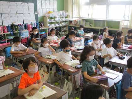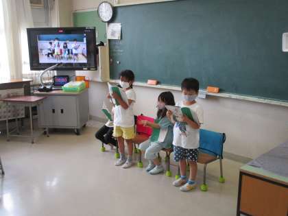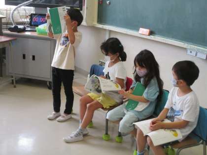「うんとこしょ、どっこいしょ」と言ったらおおきなかぶです。1年生の国語で「おおきなかぶ」を学習しています。写真はグループごと発表をした様子です。