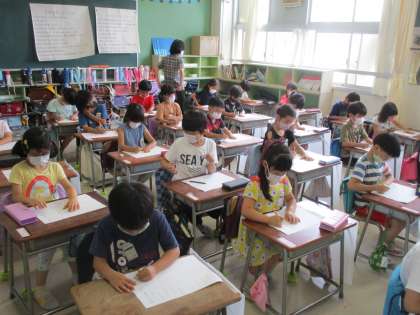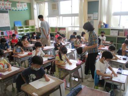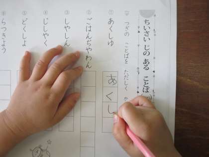 1年生の国語で「小さい字のある言葉」を学習しました。握手(あくしゅ)は小さい「ゅ」をつけて「あくしゅ」になります。1年生にとって難しい学習です。